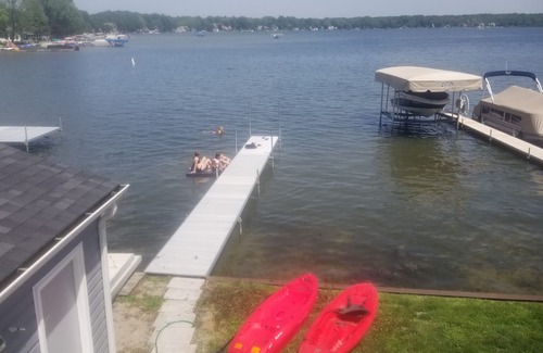 Sleeps 9 people all on beds. Driveway accommodates 2 cars, garage can fit one more. Swim off our dock, or go boating. Round lake has a public boat launch so you can bring your own boat with you and tie it to our dock during your stay. We provide 2 kayaks for our renters' usage as well.