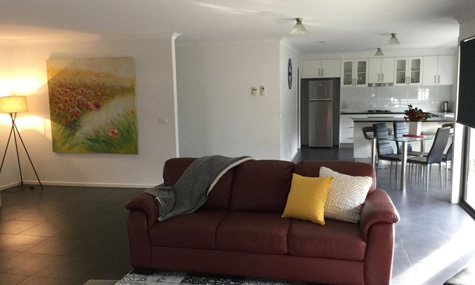 Bright & beautiful open space living, big bedrooms with built in robes, double garage plus extra car space, 1.5 bathrooms and a fully equipped kitchen & laundry. Located in a quiet street with coffee shop and takeaway restaurants just a short walk away. Weather your holidaying or travelling for work this modern house has everything you need, including desk space and WiFi. Only 10 mins walk to the center of town.
