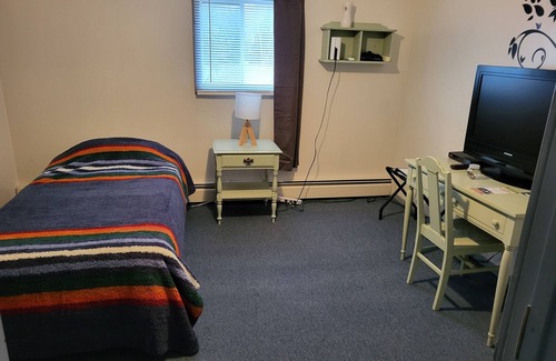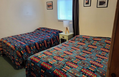 Two bedrooms, each with a queen bed and twin bed. Also the leaving room has a futon, dining table for four, small bar, pantry, kitchen includes; air fryer, coffee maker, microwave, refrigerator, stove, dishes and utensils along with Dish TV and wifi.