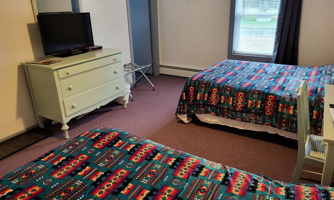 Two double beds, work station, coffee maker, microwave and small refrigerator.