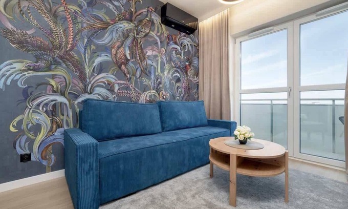 The stylish 33 m² flat can accommodate 4 people. Its space is filled with elegant shades of white, beige and navy blue design elements. Top-quality furnishings will make our guests feel truly special and allow them to spend pleasant moments during their stay in Rzeszów. The flat consists of a living room, kitchenette, bedroom, balcony and bathroom. The cosy living room is equipped with a double sofa bed, coffee table, chest of drawers and a modern TV with SmartTV function. WIFI is also provided in the flat. With these facilities, our guests will be able to watch their favourite films and series. The separate bedroom has a comfortable double bed, mirror and bed linen. The functional kitchenette is equipped with all the utensils necessary for preparing meals. Amenities such as a dishwasher, oven, microwave and fridge with freezer are available. The modern bathroom has a shower, washing machine, towels and a hairdryer. The balcony offers a picturesque view of the city and the river, which can be enjoyed with a cup of your favourite morning coffee. The flat also has additional amenities such as air conditioning and a parking space in the underground garage.