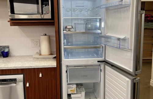 • Fully equipped kitchen with Bosch induction cooktop, oven, microwave, dishwasher, water filter, and ice maker