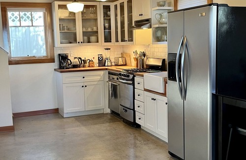 Downstairs provides sitting room, a gorgeous half bathroom, and a well-appointed kitchen should you choose to cook. Enjoy the bottle of wine in the fridge – I made it at the winery where I work.