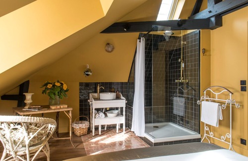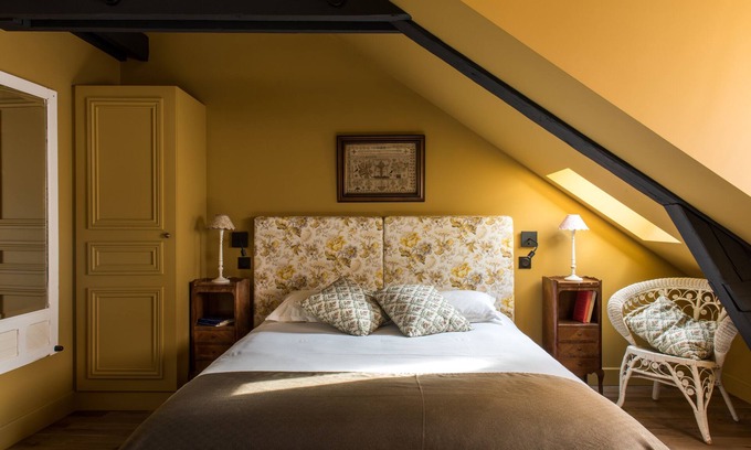 Albertine is an adorable attic apartment in Dieppe. With its exposed beams, and its bright yellow color (India Yellow 66 from Farrow & Ball), you will be charmed by the beautiful volume of the separate bedroom. This homestay accommodation in Normandy is laid out with a fully equipped kitchen and separate toilet. In this highly atypical accommodation in Dieppe, the shower and the washbasin feature directly in the bedroom. This wonderful apartment is located on the second floor of Villa Augustine in Dieppe. Enjoy the elegance, the charm and the taste of time found again. Be inspired by the spirit of Albertine.