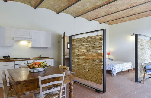 Alborata is a rustic Tuscan farmhouse entirely built in stone, dating back to the beginning of the last century and located a short distance from the town of San Giovanni d'Asso, in the unmistakable and characteristic landscape of the Crete Senesi.During the recent and careful restoration phase, the travertine staircase, the flooring in a precious Tuscan terracotta, the attics with the characteristic vaults and, on the first floor, the attics with exposed beams and bricks were placed on the ground floor. leaving intact, however, the original structure of the peasant houses of the past.The choice of furnishings reflects the style of the Tuscan tradition, sober and comfortable but elegant at the same time.Alborata is the ideal place for all those who want to spend a holiday completely immersed in unspoiled nature and in the most ancient history that these places have managed to preserve over time and which today represent the testimony of a rich and exciting past.Its favorable position, in fact, allows you to visit with short trips the numerous villages in the surroundings such as Montepulciano, Montalcino, Pienza, full of charm and inviting food and wine proposals and also to organize day trips to the main art cities of Tuscany such as Siena and Florence.