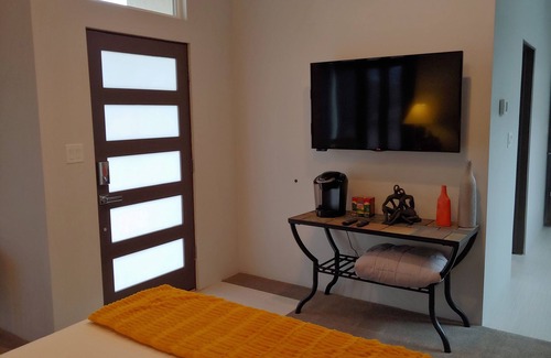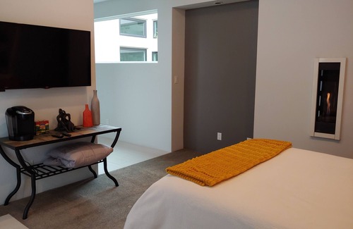 Wake up to sunshine and hot air balloons; go to sleep with beautiful city lights from the Albuquerque west mesa. Casita retreat is attached to an ultra contemporary custom home built in 2013 and sits on 1.25 acres in an exclusive subdivision of Paradise Hills. Plenty parking and conveniently located - two blocks to Paseo del Norte and 15 minutes to either I-25, I-40, and Rio Rancho. Amenities include a new (January 2023) comfortable king bed and mattress, high quality bedding, towels, robes, desk, dining table, microwave, mini refrigerator, hot plate, dishes, pots, pans, silverware, Keurig coffee maker, walk-in closet, 45" TV, full length mirror, custom blinds, and gas fireplace. Casita retreat is +/- 500 sqft and is set up like a second master bedroom, if needed, when the entire home is rented, but is appropriately secured from the rest of the home and private with its own exterior door and access using a keypad. Heating and cooling is independent of the entire property. Stroll through the neighborhood or enjoy stores, parks, local restaurants, and even Dutch Bros Coffee within walking distance. Outdoor grill is available upon request and without additional charge if left clean by guest. Complimentary coffee pods, tea packets, sugar, cream, snacks, water, and drinks provided. Body lotion, body wash, and sample size shampoo, and conditioner provided as a courtesy.