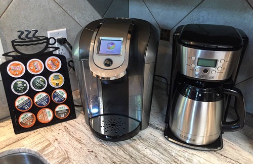 The main level of the house features an updated kitchen and a large dining/living area. The primary bedroom and a full bathroom are also located on the main level. The kitchen is equipped with stainless steel appliances, a Keurig K-Cup coffee maker, and traditional coffee maker. The kitchen is fully stocked with dishes, silverware, cookware, a toaster, and a blender. The living room and dining area both open to an outdoor deck that wraps around the back of the house.