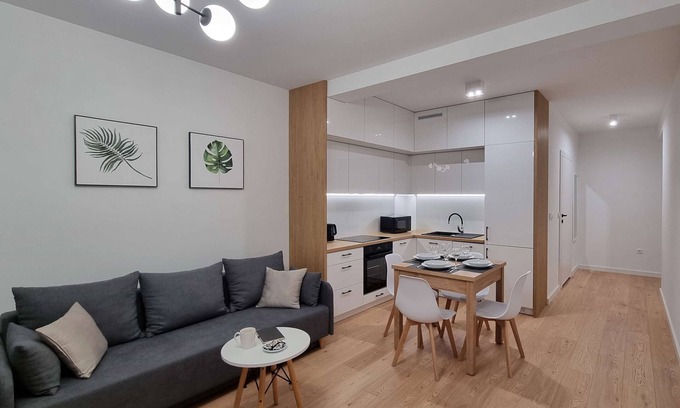 This unique, tastefully furnished studio of 43 m² provides comfortable accommodation for 4 people. The layout of the rooms includes a living room with a kitchenette and a bathroom with a shower. A modern interior, where aesthetics go hand in hand with functionality, can not only be pleasing to the eye, but also provide comfort and convenience during your stay. A cosy living room in light colours is elegant, but also exceptionally pleasant. Well-chosen lighting and soft textiles further enhance the atmosphere of relaxation and tranquillity. A soft sofa with a sleeping function ensures a peaceful night's sleep and relaxation after an eventful day. Separated by a glass wall, the space with a double bed provides a peaceful night's sleep and rest after a busy day. The kitchenette, whose design creates a harmonious whole with the rest of the flat, has been equipped with top quality appliances. The oven, induction hob, dishwasher and refrigerator allow you to prepare a home-cooked meal to be enjoyed at the communal table. Evening entertainment is provided by multimedia, such as a flat-screen Smart TV with Internet TV and free Wi-Fi access. Guests are provided with complimentary toiletries, towels and bed linen for a good start to their stay. A washing machine is an added bonus for added comfort during longer stays.