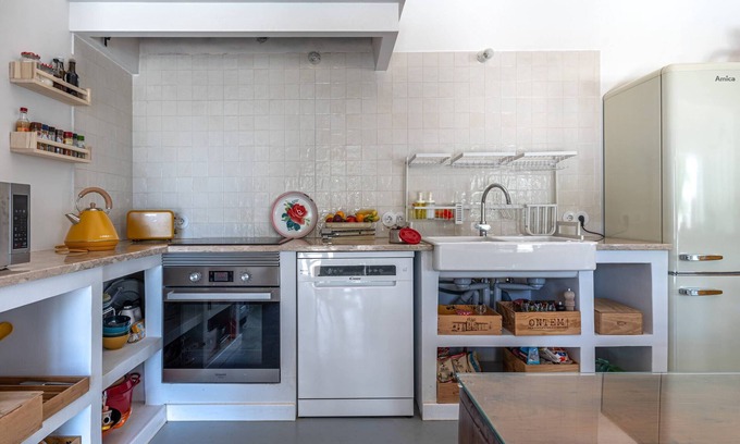 In Casa Lisboa you will find an open plan living area with a fully equipped kitchen (with induction hob, electric oven, dishwasher and large fridge), a dining area with table and chairs and an ample living area with two sofas and a reading nook with two armchairs overlooking the garden and pool. There are two bedrooms (with a queen-size bed), each with an ensuite bathroom on the ground floor. One of them, the main one, has a dedicated workstation and an old footclaw bathtub. The other one has a