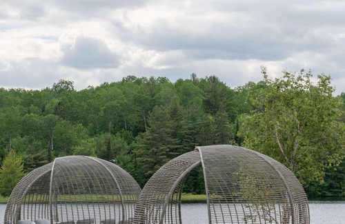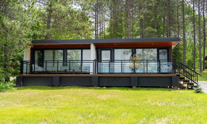 A rustic modern cottage nestled amidst the 9-acre landscape of Algonquin’s Edge. Its wooden paneling and all-glass front exterior tender a modern feel allowing guests to feel comfortable without disconnecting their link to nature. This cottage features private beachside seating and a private patio with mosquito netting for comfortable outdoor living.