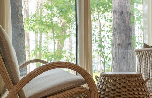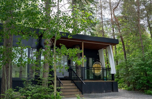 A rustic modern cottage nestled amidst the 9-acre landscape of Algonquin’s Edge. Its wooden paneling and all-glass front exterior tender a modern feel allowing guests to feel comfortable without disconnecting their link to nature. This cottage features private beachside seating and a private patio with mosquito netting for comfortable outdoor living.