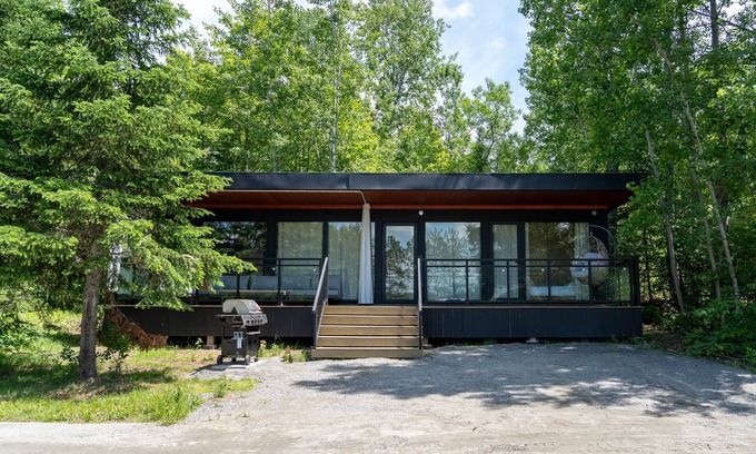 A rustic modern cottage nestled amidst the 9-acre landscape of Algonquin’s Edge. Its wooden paneling and all-glass front exterior tender a modern feel allowing guests to feel comfortable without disconnecting their link to nature. This cottage features private beachside seating and a private patio with mosquito netting.