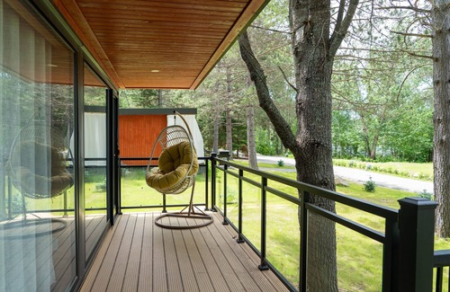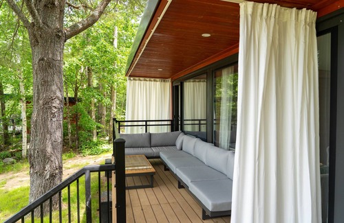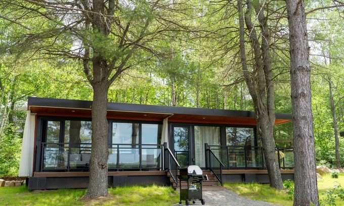 A rustic modern cottage nestled amidst the 9-acre landscape of Algonquin’s Edge. Its wooden paneling and all-glass front exterior tender a modern feel allowing guests to feel comfortable without disconnecting their link to nature. This cottage features private beachside seating and a private patio with mosquito netting for comfortable outdoor living.