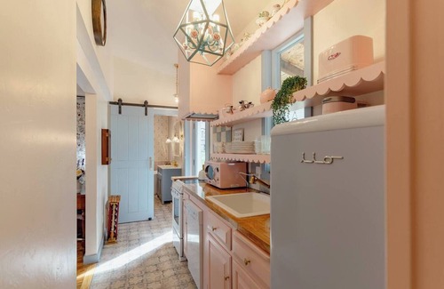 Escape to the Alice in Wonderland Cottage in Honesdale, PA, meticulously designed for an immersive wonderland experience. Perfect for Alice or cottagecore fans, this enchanting retreat sleeps up to 4 with a bedroom & cozy loft, both w/ queen beds. In the Poconos & just 2.5 hours from NYC or Philadelphia, it includes a pink kitchen, themed living room, vintage sofa, internet, ROKU, board games, workstation, and a luxurious two-person soaking tub. Explore nearby Main Street’s eateries and shops.