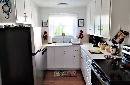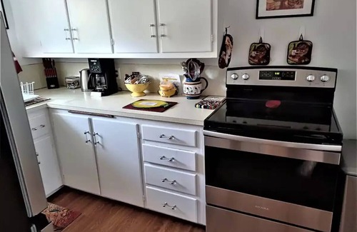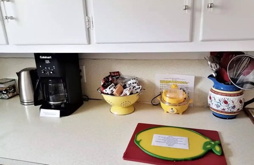 fully equipped kitchen if you like to cook plenty of pans, baking pans, mixing bowls etc. Dishes are vintage pottery and we also have children's dinnerware (bpa free). Various electrical appliances. Free snacks and beverages plus breakfast foods (complimentary one dozen eggs & package of 6 English muffins plus electric egg cooker to make it easy), oatmeal, coffee, coffee mate, tea, hot chocolate. We provide a selection of condiments such as mayo, ketchup, mustard, jams, peanut butter, butter, margarine etc. and numerous spices plus honey, sugar, non sugar sweetener, instant soups and much more.