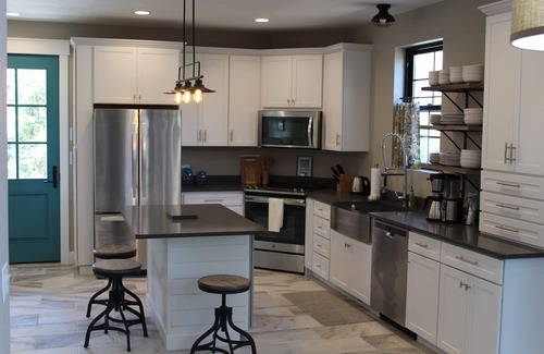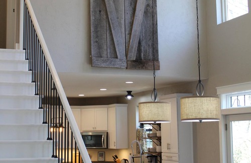 The Finch House is a beautiful home designed with you in mind. From the moment you walk through the door, the open floor plan and modern conveniences will make you feel right at home. Distinctly appointed, this home offers everything you will need to make your stay all you'd hoped it would be. As you enter, the open kitchen overlooks the dining and living area with a view of the 21 foot tall stone wood burning fireplace. Off the living area, but close to the action, is a cozy sitting and entertainment area, that has a wall mounted 55" smart tv with Xfinity cable. The first floor master offers a king bed, dresser, and night stands. The master bathroom and walk-in closet are located off the bedroom separated by a beautiful barn door. The first floor also has easy access to a powder room, open laundry area and closet. The second floor contains two large bedrooms with a shared bath. The bedroom, with a queen bed, sits overlooking the creek and also contains barn style doors that can be opened to look down on the living area and fireplace or closed for privacy. The second bedroom contains a twin over full bunk and a loft style bunk bed. Decorated in a National Park outdoor theme, this room is designed to get the adventurer juices flowing for both young and old. Continue down the open hall past large old barn beams to the open loft that has views of the creek, living room, and dining area. The loft has a wall mounted 55" smart television, couch and reclining chairs. This home contains plenty of board games, books, and puzzles for all ages.