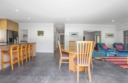 This holiday home features a spacious open-plan living area that seamlessly integrates the dining and kitchen spaces, flowing effortlessly onto a covered deck at the rear of the property. Here, you'll find an outdoor dining suite with seating for eight and a Weber BBQ, perfect for al fresco dining.