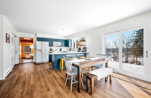 The natural light-filled living room has large windows to enjoy the view outside. You can stream YouTubeTV, Netflix, Hulu, etc. There's plenty of comfy seating to lounge or play games together. There’s also a wood burning fireplace for some extra warmth if you need it, and a sliding door to the back deck to let in the fresh air.