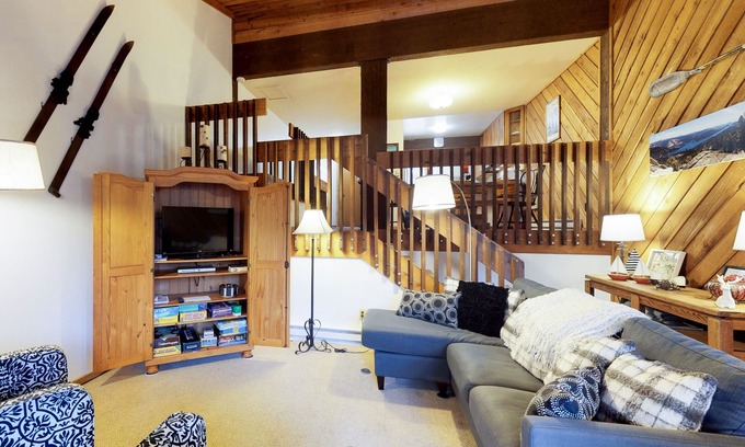 This two-level property is located in Huntington Condos, a wonderful complex that sits among the evergreens just beyond the northern shores of Huntington Lake. Spend summer days in the shared outdoor pool and hot tub, take afternoon walks a quarter-mile down the road to Rancheria Marina on the lakeshore, and hit the winter slopes at China Peak Mountain Resort only two miles south.