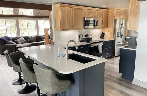Only 2 hours away from Chicago on all-sport Little Fish Lake. Enjoy 100 ft of private beach with NEW SAND in 2024 during the day and a BBQ dinner on the 12x30 composite deck. Utilize one of the fully loaded kitchens with wet bar steps away from the backyard as well as a campfire at night. This property boasts a theatre/game room with a 120” big screen, pool, poker, dartboard and enough seating for everyone. Take advantage of 4 kayaks, 1 paddleboard, 1 rowboat, 1 paddleboat, private dock, water trampoline, fishing poles and the XL floating mat. This is a great get away for families of all sizes or enjoy a weekend away with friends. Relax on the terraced yard with Jumbo Connect 4, Bucketball and more!