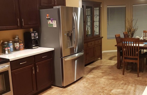 The fully landscaped large backyard boasts a view of the Superstitions. There is a covered, furnished patio with a celing fan and light. Make use of the full-size outdoor barbeque on those warm AZ evenings. Enjoy our beautful, pebble-tech pool (NOT HEATED) relax, rejuvenate and make memories under the beautiful Arizona skies, whether it be sunshine or the twinkling stars at night.