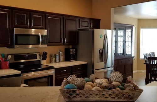 Comfortable, spacious kitchen with Quartz counter tops, mohogany stained cabinets, a Keurig coffee maker( and regular coffee maker), toaster, and all stainless steel appliances. The Kitchen is fully stocked with plenty of utensils, baking and cooking pans, crockpots, electric skillet and dishes for at least services of 8. Full compliment of plastic dishes: bowls, plates, cups etc.. for outdoor and pool use. Basic spices cooking oils and coffee. Nice large, open floor plan from dining area to kitchen to living area. Great for family entertaining.