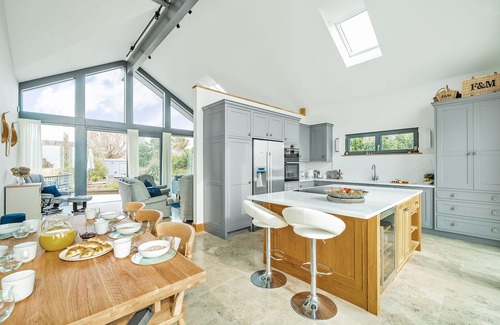 Overlooking the National Trust owned coastline, with views down to Hive Beach, part of Dorset's world-famous Jurassic Coast, All Ways is a light-filled and spacious detached holiday home by the sea. This architect designed house has an impressive double-height day space which includes an airy sitting room with comfortable seating and a 55" Smart television, a fully-equipped kitchen with central island and a family dining area. The wall of tall windows at the front and rear of the property offer wonderful views and allow you to fully connect with the outdoors, regardless of the weather, with doors that lead out to the terrace, garden and barbecue area directly from the sitting area.