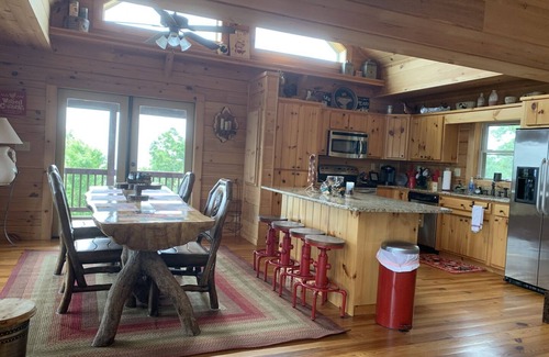 Cedar Rock Cabin is a stunning 5 bedroom, 4 1/2 bath with spectacular 200° plus year round views. Imagine the star gazing, sunrise and sunsets! The deck wraps around 3 sides, is both covered and open. Sit and rock in the chairs along with chaise lounges and a table with 4 chairs for eating outside. A propane grill is provided for the grill master. The views can be seen from all points on the deck and from within the cabin. Step inside to a wide open floor plan, a well stocked kitchen with updated appliances, and an island with 4 stools for the kids. The dining area seats 6. The Great Room has plenty of windows to let the sun shine in, along with 2 French doors leading out to the deck. 2 comfy couches, rocking chair, and large chair, along with flat screen TV, Dish TV, and a wood burning fireplace make for relaxing family time. There is also a half bath off the entrance hall. There is a master bedroom on the main level with an en-suite bath. Other bedroom with an en-suite bath is located upstairs. Heading downstairs are three bedrooms. Guest bedroom with Queen bed, Kids bedroom with 2 twin beds, and another Guest bedroom with Queen bed also. 2 full baths are located just outside the Guest bedrooms. One has pedestal sink with walk-in shower only, while the second also has pedestal sink but tub/shower combo. Washer and dryer are on this level in their own area. The family room boasts flat screen TV with Dish, pool table, 2 couches and 2 easy chairs. Nap time? French doors lead out to the ground level garden and the fire pit. S'mores are a must. Come and enjoy Cedar Rock Cabin. This wonderful home with it's awesome views and peacefulness, will be the vacation you, family, and friends will talk of for quite some time. See you again next year!