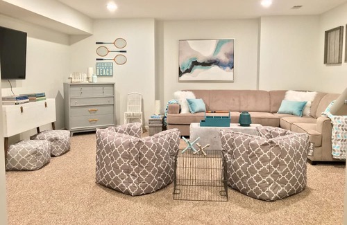 - Media room in finished basement has a 55” LED flat-screen SMART TV, comfortable sofa sectional seating & full bathroom