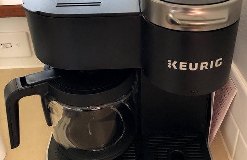 There is a full kitchen with cookware, plates and utensils provided. A Keurig Duo coffee maker allows you to brew a single cup or your own ground coffee in a pot.