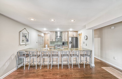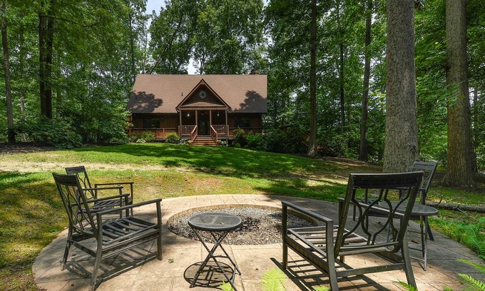 Upstairs, you'll find a lofted sitting area with a private library and a Papasan chair. A spacious sleeping area also enjoys an A-frame ceiling, a skylight, and a bathroom with a jetted tub, a walk-in shower, and a skylight. Your summer guests will love the home's central air-conditioning during the day and the firepit for those evening s'mores sessions. When you're not splashing around in the lake, challenge a friend to a game with the driveway's basketball hoop or a game of cornhole. Have a little work to do during your stay? The home's free WiFi makes working and studying from the lake possible.