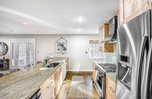Head down a scenic gravel road to find this completely remodeled, allergy-free, lakefront home nestled in the trees. This gorgeous villa is the picture of luxury and convenience, with hardwood floors, vaulted ceilings, and floor-to-ceiling windows overlooking the back deck. Summer visitors will love spending time on the private beach (on the private and warm side of the lake!) and taking the provided kayaks and stand-up paddleboards out for lazy afternoons on the lake's sparkling water!