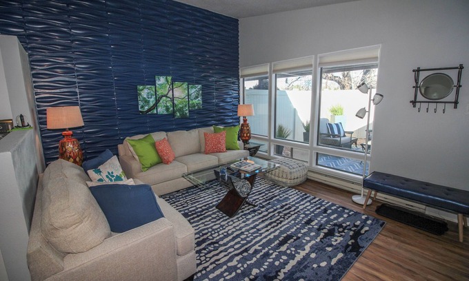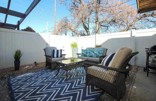 You will love the open floorplan with a private patio, off-street parking and storage for bikes or sporting equipment. All new contemporary, yet comfortable, decor and furnishings that will make you feel like it's your own home! Washer and dryer, outdoor grill with spacious shaded private patio for enjoying our beautiful Colorado weather. As you enter, the comfy living area with a 65" smart TV and high speed Wi-Fi welcomes you. There is plenty of room to work or play.The fully equipped kitchen is open to the living room and dining area. At the end of the hall is the Master Bedroom. The bedroom features ceiling fan, dresser, and full-size closet.The bathrooms have been completely updated and provide everything you might need including a hairdryer and make up mirror. Big windows between the open living area and patio create a beautiful connection between the inside and outdoors. A great area to relax or visit with friends and family. There are two restaurants and a coffee shop right across the street if you don't want to cook! We have a highchair, Pack & Play and baby seat / swing for those with small children. A variety of books and movies are available for your use while staying with us. Your family will feel right at home!