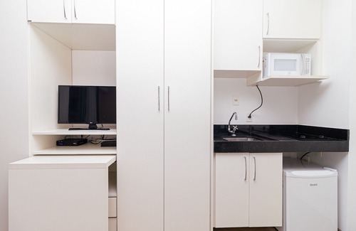 Complete accommodation for your stay, the space is modern, well used and decorated in gray and white colors for you to stay in comfort and elegance on Rua Turiassú next to Allianz Parque, with minibar, induction stove, microwave, kitchen utensils, air conditioning, queen-size bed, wi-fi and television.