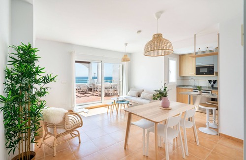 Located in an idyllic setting on the front line of Mojácar's Palmeral beach, this 2-bedroom, 2-bathroom flat offers a privileged experience by the Mediterranean. It is a penthouse with spectacular sea views with garden furniture and sun loungers, designed to make the most of the sunny climate of the Almeria coast. The kitchen is fully equipped with electrical appliances and kitchen utensils.