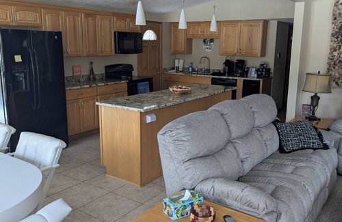 Kitchen: granite counter tops and island, all new appliances including dishwasher, trash compactor, double oven, microwave, refrigerator/freezer with ice maker. Small appliances include a blender, mixer, griddle, coffee maker, Keurig one-cup coffee maker, toaster, and more. Dining table seats 8 comfortably.