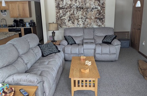 Living room: large flat screen TV with Dish Network and DVD/VHS player. Comfy reclining couch and love seat--perfect for a mid-day vacation nap. Entertainment closet filled with DVDs, books, puzzles, and board games.