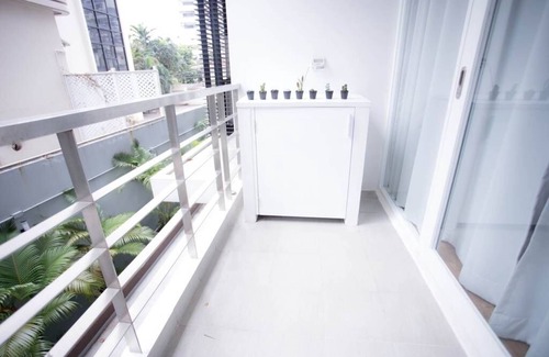 The studio itself contains one bedroom with a comfortable double bed, bedside table, closet, flat screen TV, DVD player, a working desk, a living area, an in-suited bathroom with shower and basic amenities, a kitchen with microwave, fridge, and cooking wares, a washing machine, an iron, a balcony, free Wi-Fi, and keycard access. A swimming pool and 24 hour securities are offered in the main building.