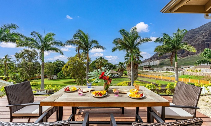 Kick back in the heart of Makaha Valley at Aloha Breeze, a 4BR retreat that puts you 10 minutes from the beaches of Oahu. With a stunning view of tropical mountains and the ocean from your backyard, this modern Hawaiian escape blends style, space, and a beautiful location to give you an island experience like never before.
