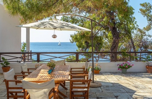 The villa itself is spacious and opens onto wide verandas and sun-drenched terraces framed by oleander, olive, and pine trees. Simply yet comfortably furnished, Villa Alonissos blends naturally into its stunning seafront surroundings.