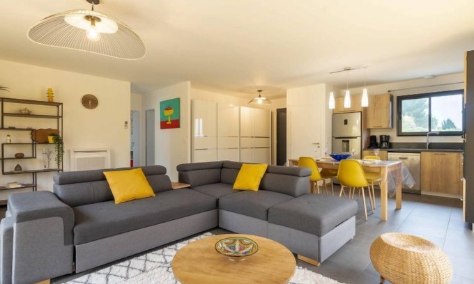 3-room house 82 m2, west facing position. Comfortable and beautiful furnishings: living/dining room with TV and flat screen. Exit to the terrace. 1 room with 1 french bed (140 cm, length 190 cm). Exit to the garden. 1 room with 2 beds (90 cm, length 190 cm). Open kitchen (dishwasher, 4 induction hot plates, toaster, kettle, microwave, electric coffee machine). Shower/WC. Electric heating. Terrace 15 m2, west facing position. Terrace furniture, barbecue. Facilities: washing machine, iron. Parking. Please note: non-smoking house. Offer by a private individual according to Art. 155, IV of CGI.