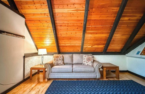 Step into this charming home upper unit through a private entrance that welcomes you into a spacious entryway, perfect for relaxation. Here, you’ll find a foosball table and ample closet space for your coats and gear. Ascend the large stairwell to reach the loft, which features a cozy den area complete with a TV, games, and books, alongside bedrooms on either side. Each bedroom is furnished with two queen-sized beds.