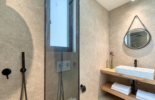 The favorable location of modern Alpha villa rests on a hill side overlooking the alluring horizon of the Aegean Sea. A welcoming terrace with comfortable built-in sofas and a dining area next to the BBQ is certain to relax your senses. In the private pool with sunbeds and the garden overlooking the endless sea view...the calmness will overwhelm you.The villa also has an open plan living area, TV corner, dining area connecting with spacious open plan fully equipped kitchen.
