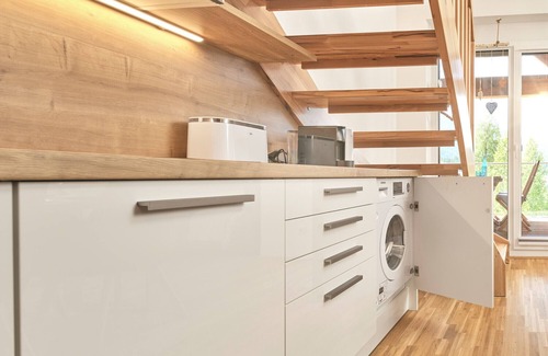The apartment is very cozy due to its alpine style, with lots of wood, and is divided over 2 floors. There is a bedroom with a double bed, 1 sofa bed on the cozy gallery, and another bed in the open living and dining area. The kitchen is equipped with modern appliances and cooking accessories. There is a Nespresso coffee machine and also a washing machine