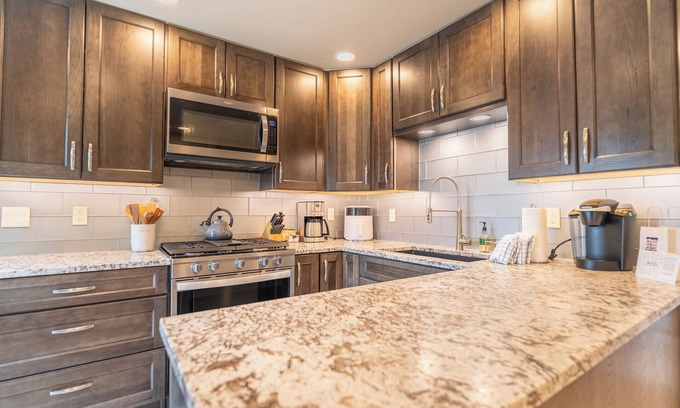 Prepare a home-cooked meal in the kitchen, complete with an oven, a stovetop, and a dishwasher, as well as an ice maker, a microwave, and cookware. And because there's a dryer, you can go a bit lighter on your packing. Other amenities include a BBQ grill, bed sheets, and heating.