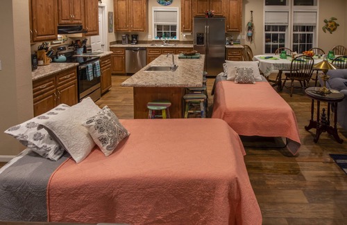 Only minutes away from world-class speckled trout fishing waters, our comfortable 3 bedroom vacation home is located on the Apalachee Bay in Shell Point, Florida (30 miles south of Tallahassee). This roomy 1708 sq. ft. modular home is located in gated Shell Point Village, which has a community swimming pool and tennis court, and a public beach within walking distance. Right out our back door is a large boat dock (with ample room for two boats) on a deep-water canal, which is just one canal over from the boat launch at the Shell Point Marina. The living quarters feature 3 bedrooms, 2 baths, family room, dining room, laundry room, fully equipped kitchen, screened-in porch and an elevator. The family room is a large, open area furnished with a fully stocked entertainment center, 65 inch TV in den, 40 inch TV by pool table, comfortable den furniture, pool table and dining room table. You can shoot pool and watch TV, while enjoying a beautiful view of the canal.