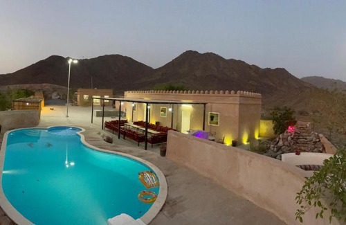 Featuring an open-air bath, Alshahad farmhouse offers accommodations in Fujairah. The air-conditioned accommodation is 17 miles from Fujairah Mall. There's an outdoor fireplace and guests can use free Wifi and free private parking. Providing a terrace and mountain views, the farm stay includes 4 bedrooms, a living room, satellite flat-screen TV, an equipped kitchen, and 6 bathrooms with a shower. Guests can enjoy a meal on an outdoor dining area while overlooking the pool views. Additional in-room amenities include chocolates or cookies. There is an on-site bar, and during warmer months you can make use of the barbecue facilities. The farm stay also provides a rooftop pool and a solarium for guests to relax in. For guests with children, Alshahad farmhouse features outdoor play equipment. Cycling, hiking, and walking tours are possible within the area, and the accommodation offers water sports facilities. Ras Al Khaimah International Airport is 43 miles away.