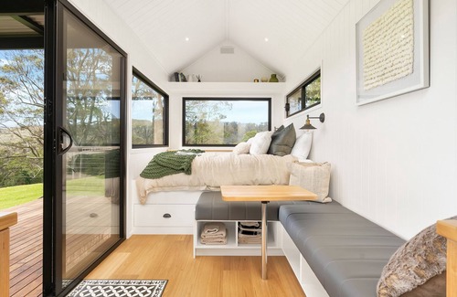 This hidden gem is a luxurious tiny home, nestled on a plateau overlooking Kangaroo Valley, with spectacular northerly views of the surrounding escarpments and lush farmland far below.