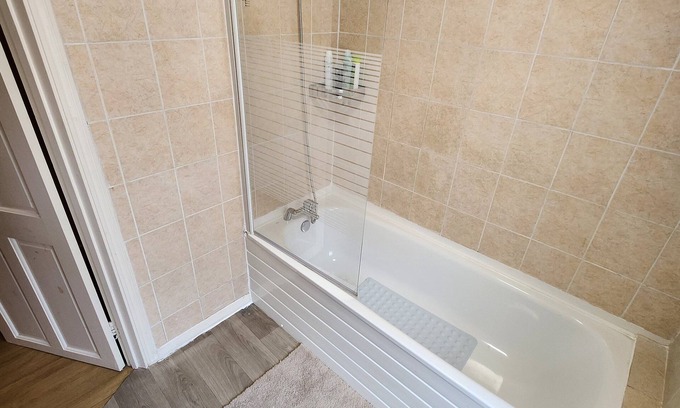 The kitchen is well-appointed with an electric cooker, fridge/freezer, microwave, and an air fryer, ensuring a pleasant stay whether you're visiting for business or pleasure. Our flat serves as a warm and convenient retreat for your journey.