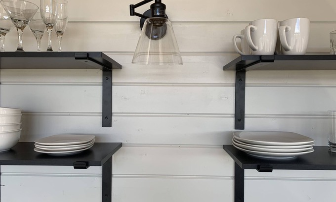 Queen bed, futon sofa (single), wi-fi, tv, full kitchen, washer and dryer, pots/pans/place settings, coffee maker, shower (no bathtub), basic pantry items including tea, coffee, sugar, cooking spray, salt, pepper, other spices, and more. There is also a deck that is partially covered over the door for weather and partially open for stargazing. Trust me, you'll want to see the stars. The deck also has a propane firepit and Adirondack chairs.